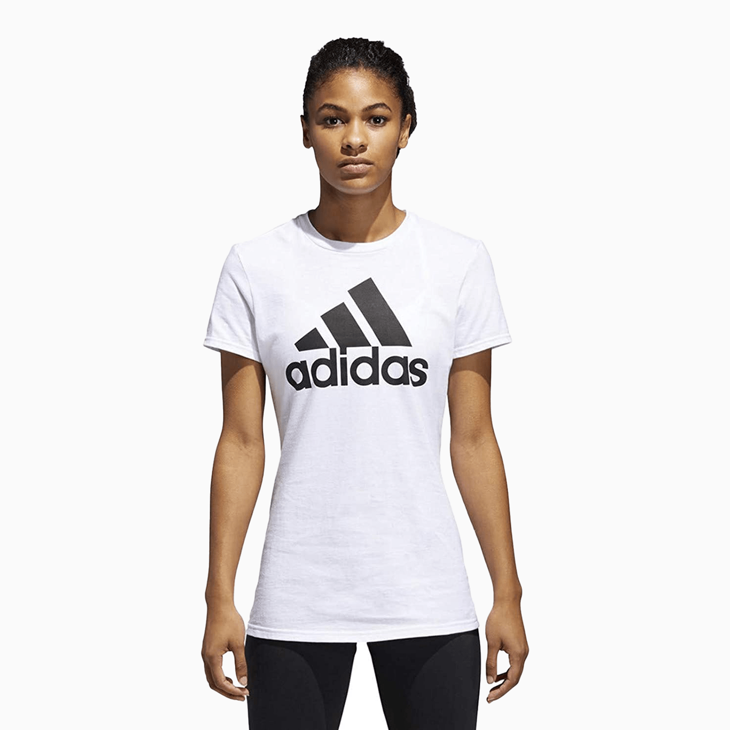Throw on this women's t-shirt as you head out after the gym and greet the streets with bold 3-Stripes style. The sporty tee is made of soft cotton and cut for a slim fit and flashes an oversize Adidas Badge of Sport on the chest.