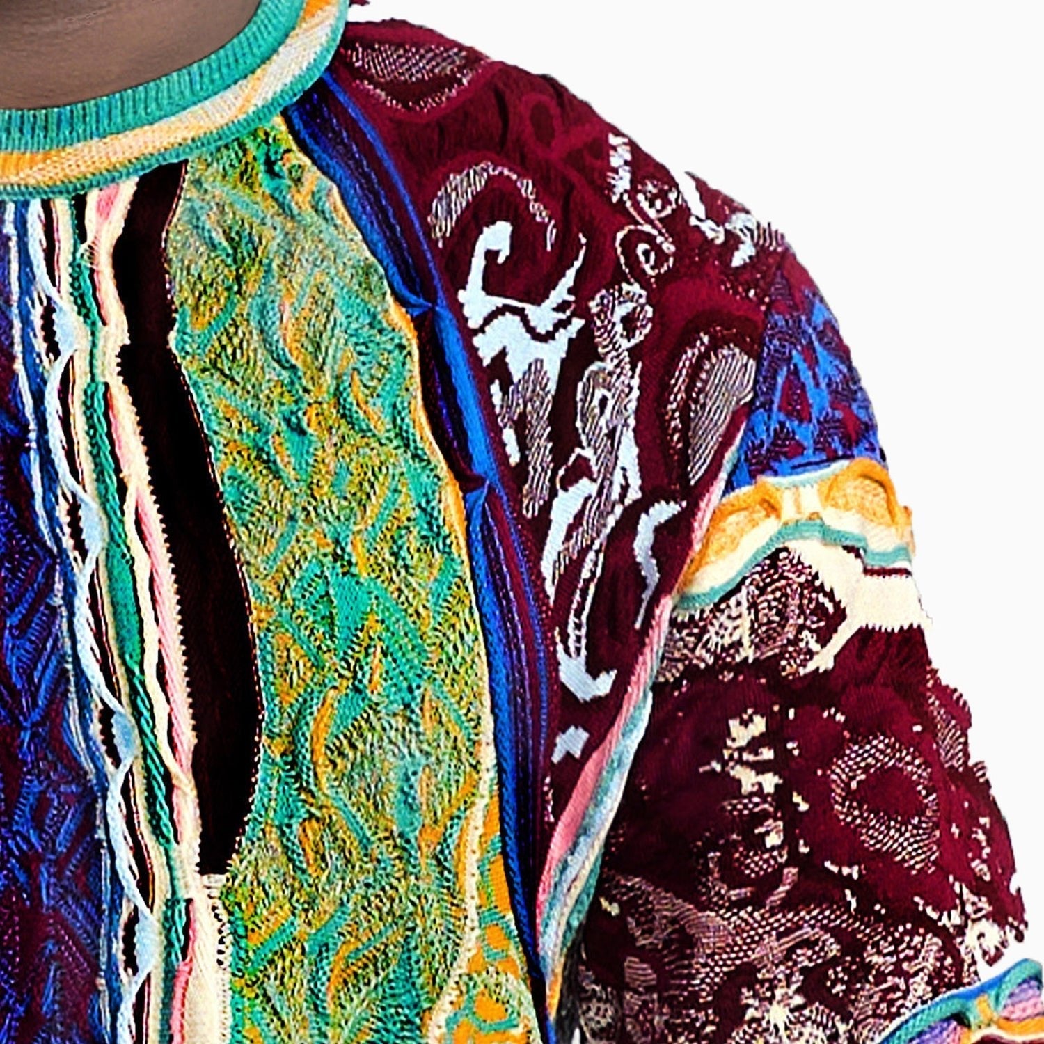 Knit in 100% mercerized cotton, the crew neck features detailed fabric composition by COOGI’s custom knitting machines. Kaleidoscopic patterns are paired with raised textures to deliver a one-of-a-kind aesthetic. Elasticized waistband and sleeve cuffs are the finishing touches on this unique garment which has a new contemporary slim fit.