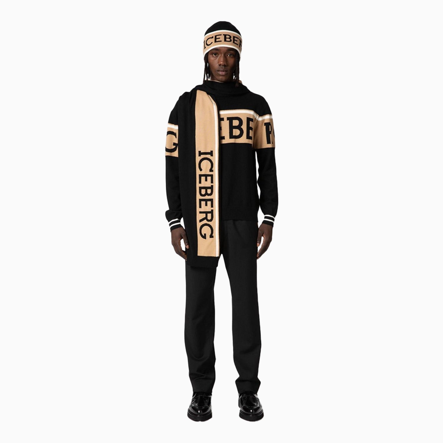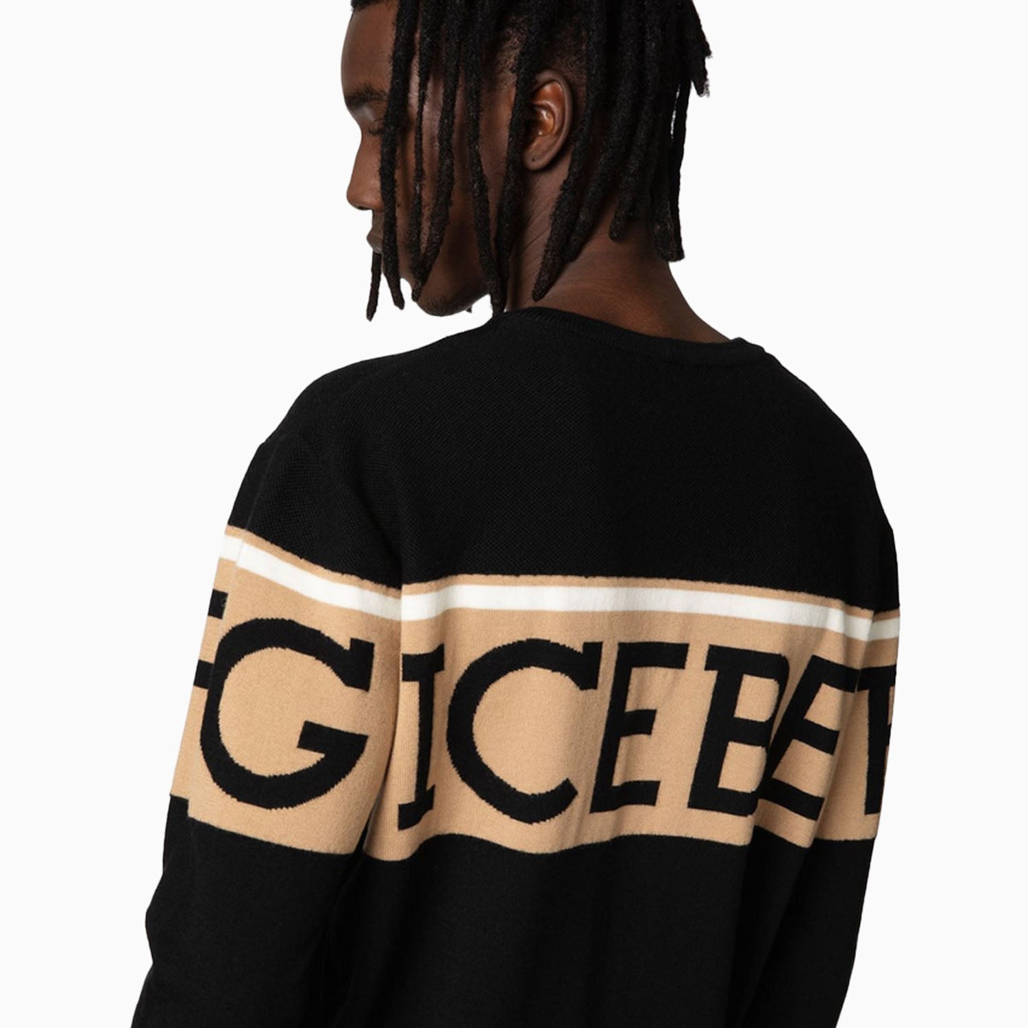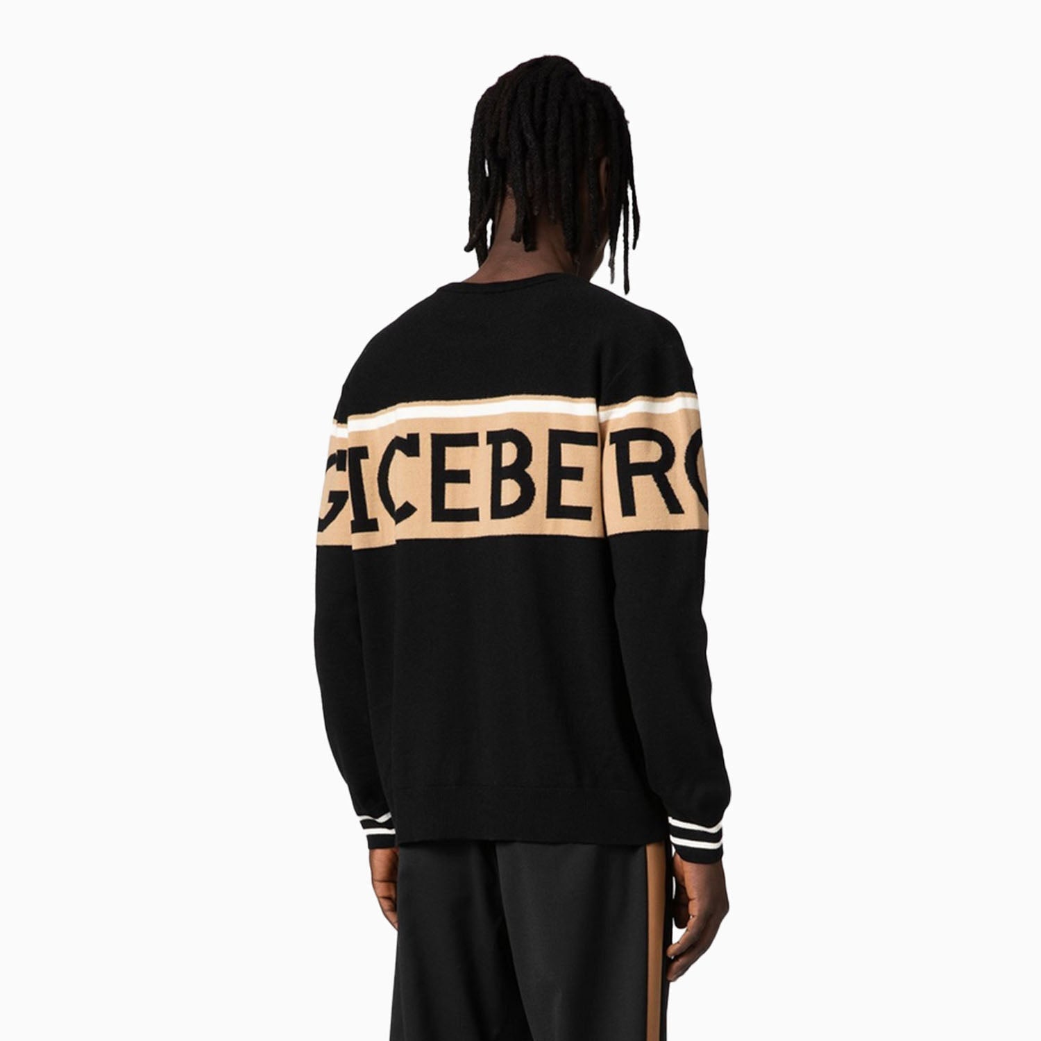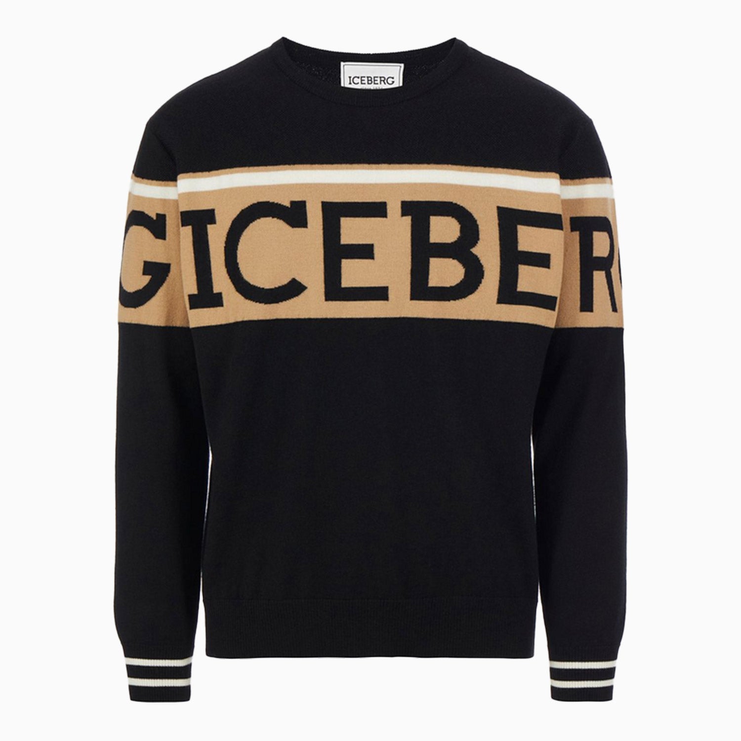 Timeless and sporty. Regular fit black crewneck sweater, in pure extrafine merino wool with crafted in stockinette stitch. The garment is characterized by the institutional Iceberg logo in double jacquard on the central band and by the striped cuffs in a contrasting color