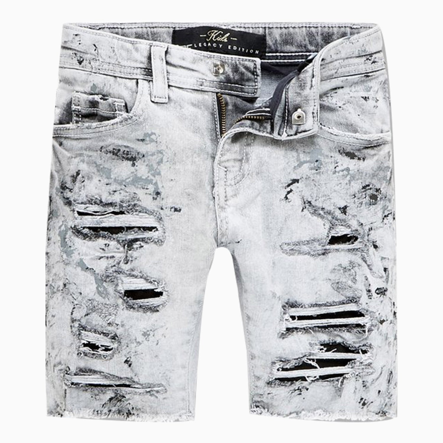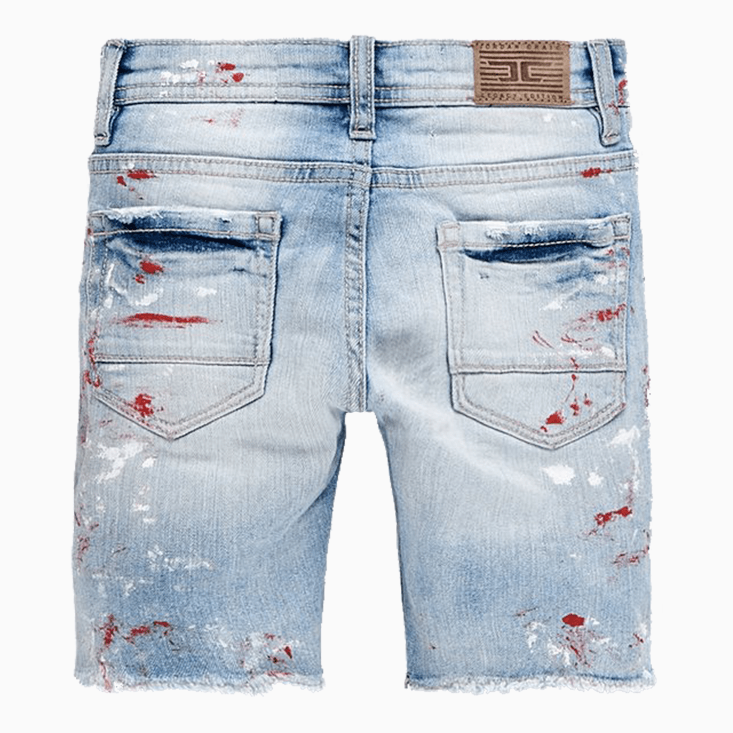 Become a kid of affable nature by Jordan Craig Kid's Vengeance Denim Short featuring regular rise, potassium brushing, rip and repair design with raw denim backing, hand smeared paint details, unique distressing on each pair, perfect for everyday wear.