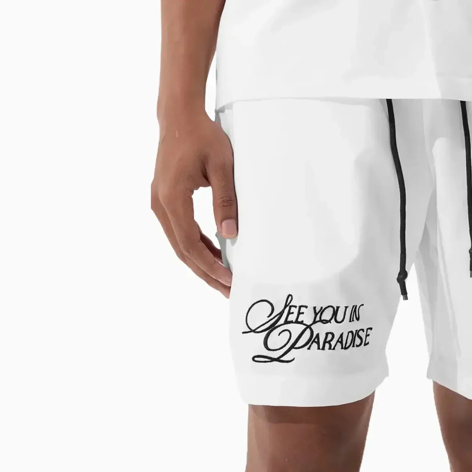 - Embroidered text on front right thigh