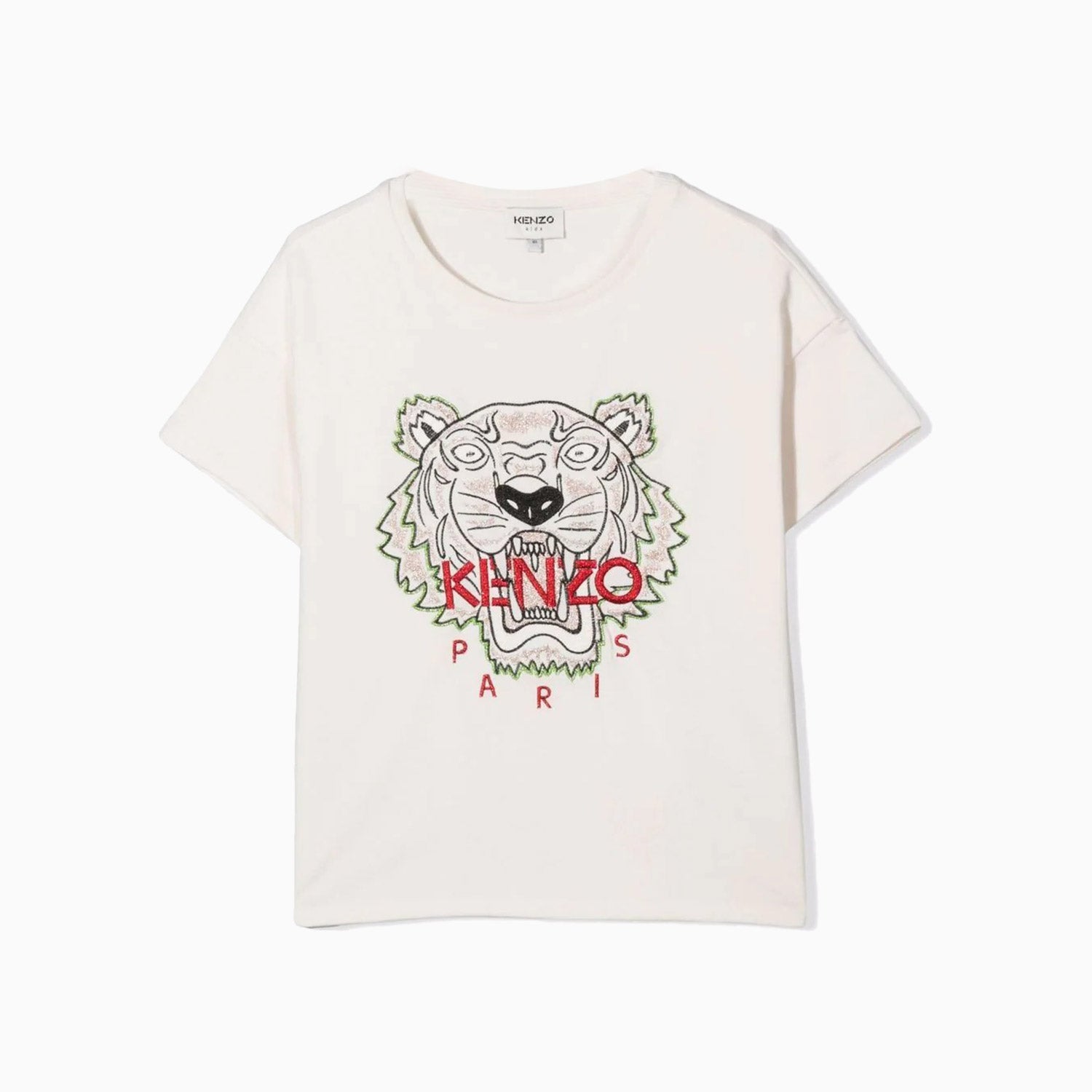 Tiger-print short-sleeve T-shirt from KENZO KIDS featuring white, cotton, signature Tiger Head motif, logo print to the front, round neck, short sleeves, and straight hem.