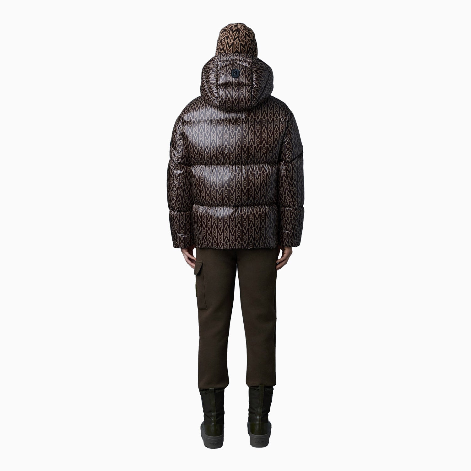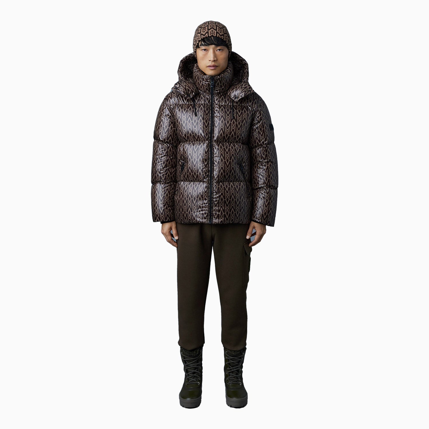 KENT-MG is a recycled light-down jacket in a bold McCarthy Monogram print with a detachable hood and adjustable storm visor. Oversized channel quilting and glossy waterproof, water-repellent, and breathable shell provide superior protection. Designed to withstand the coldest weather, a hidden drawcord hem and rib-knit cuffs add warmth, while zippered pockets keep essentials stocked.