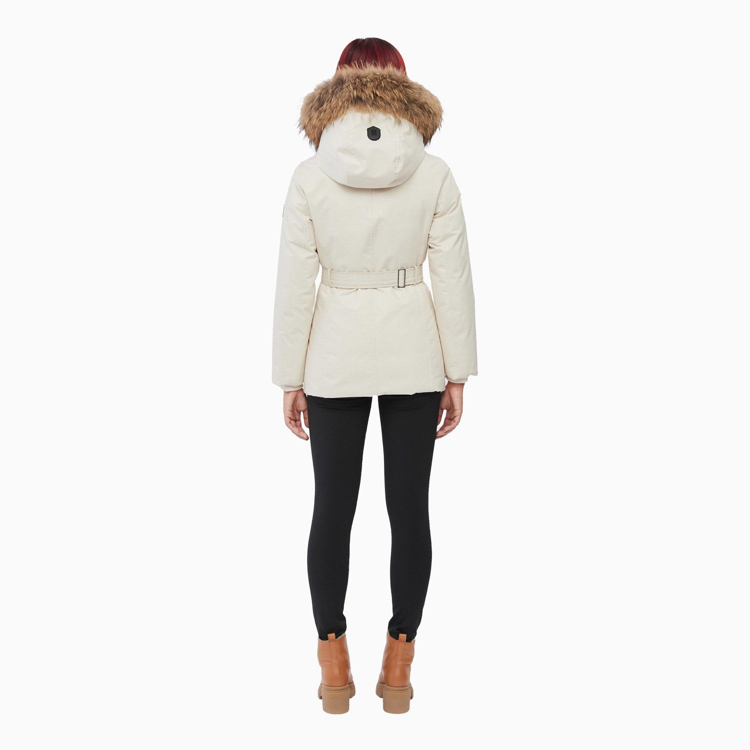 JENI is a 2-in-1 recycled down Nordic Tech parka for women with a removable lustrous down bib, natural fur trim, and adjustable storm visor hood. The structured, semi-fitted cut is accented with a ruched Velcro clasp belt. Designed for maximum comfort and protection on the coldest days, the proprietary bonded weave, storm placket, and insulated pockets add extra warmth. A high-performance staple with modern versatility.