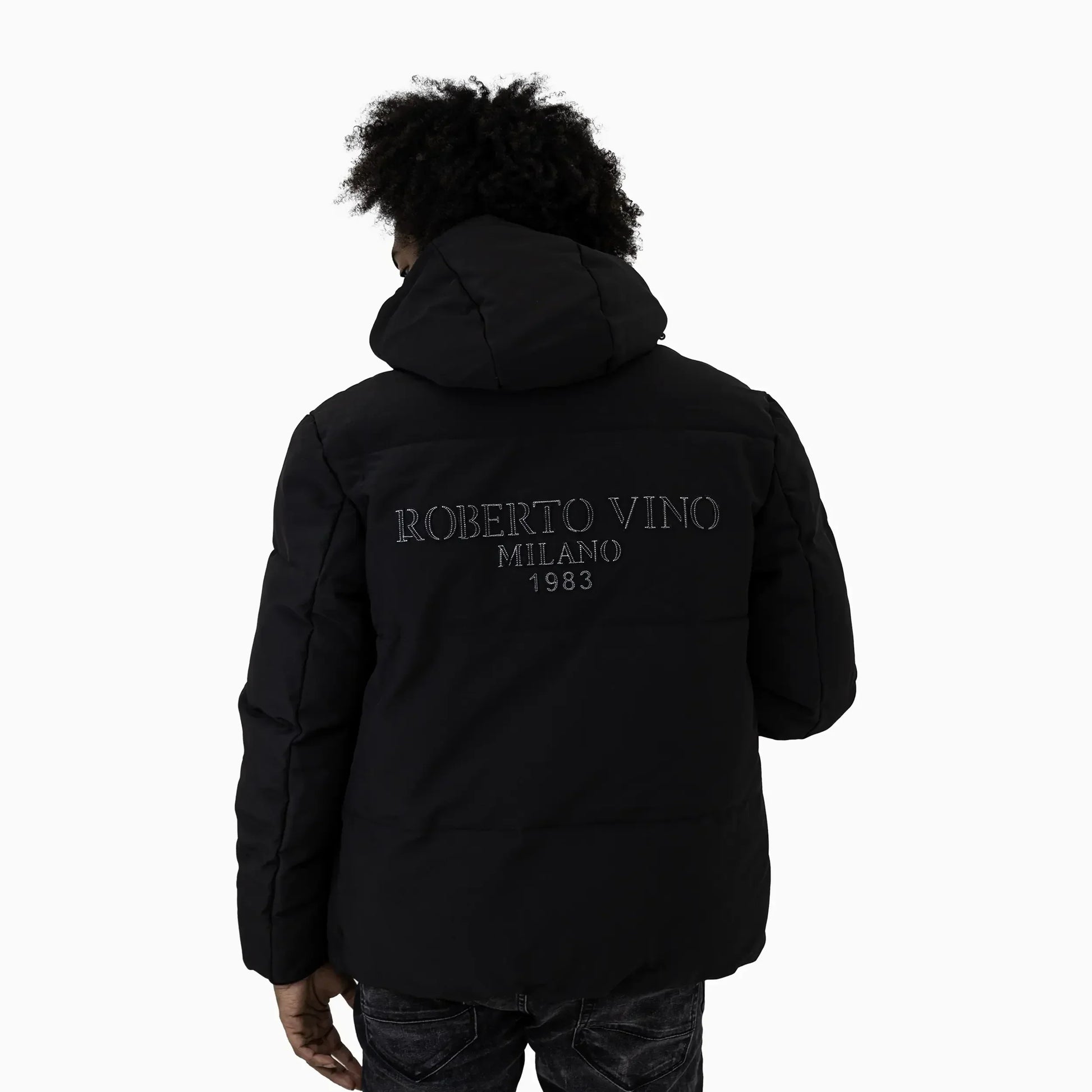 The front showcases a minimalist design with a zip-up closure and subtle branding, while the back proudly displays the iconic 'Roberto Vino Milano 1983' embroidered in bold letters. This coat is perfect for urban adventurers looking to stay stylish while braving the winter chill.