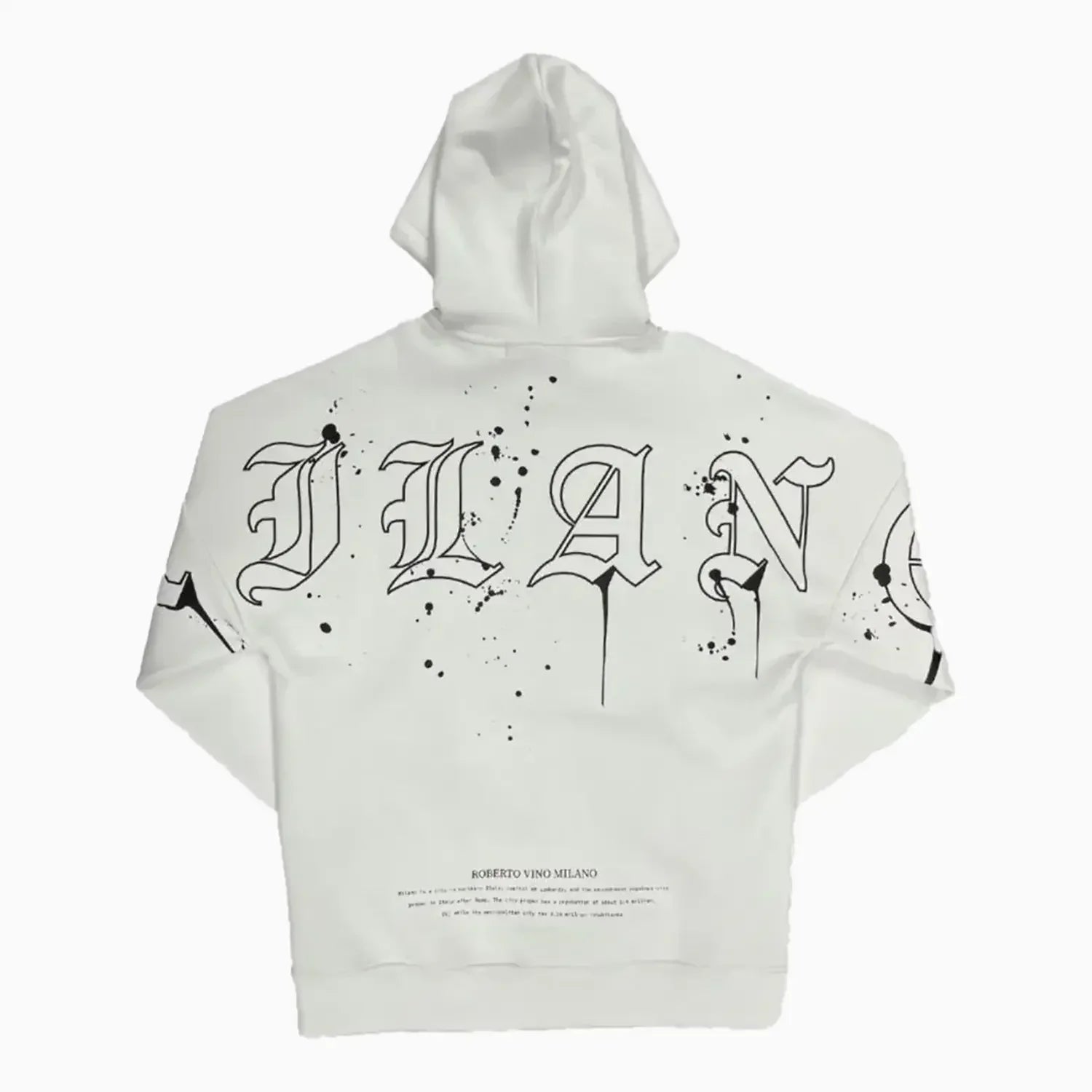 The back is adorned with large "Milano" lettering, accented by an eye-catching paint-splatter effect. Below the lettering, a Roberto Vino Milano inscription captures the essence of the brand's connection to the city of Milan. This hoodie stands out within the Milano collection as both a fashion-forward and statement-making piece.