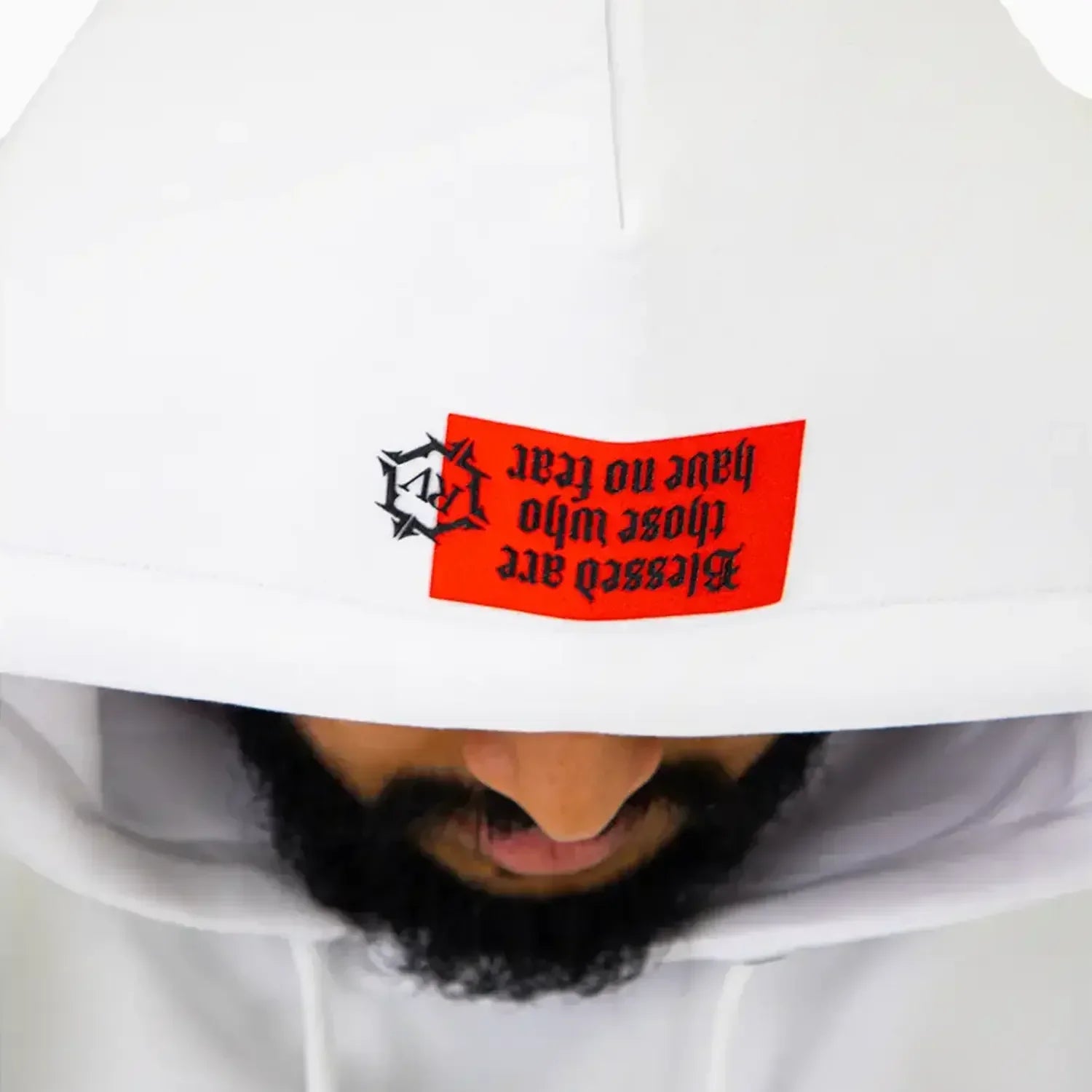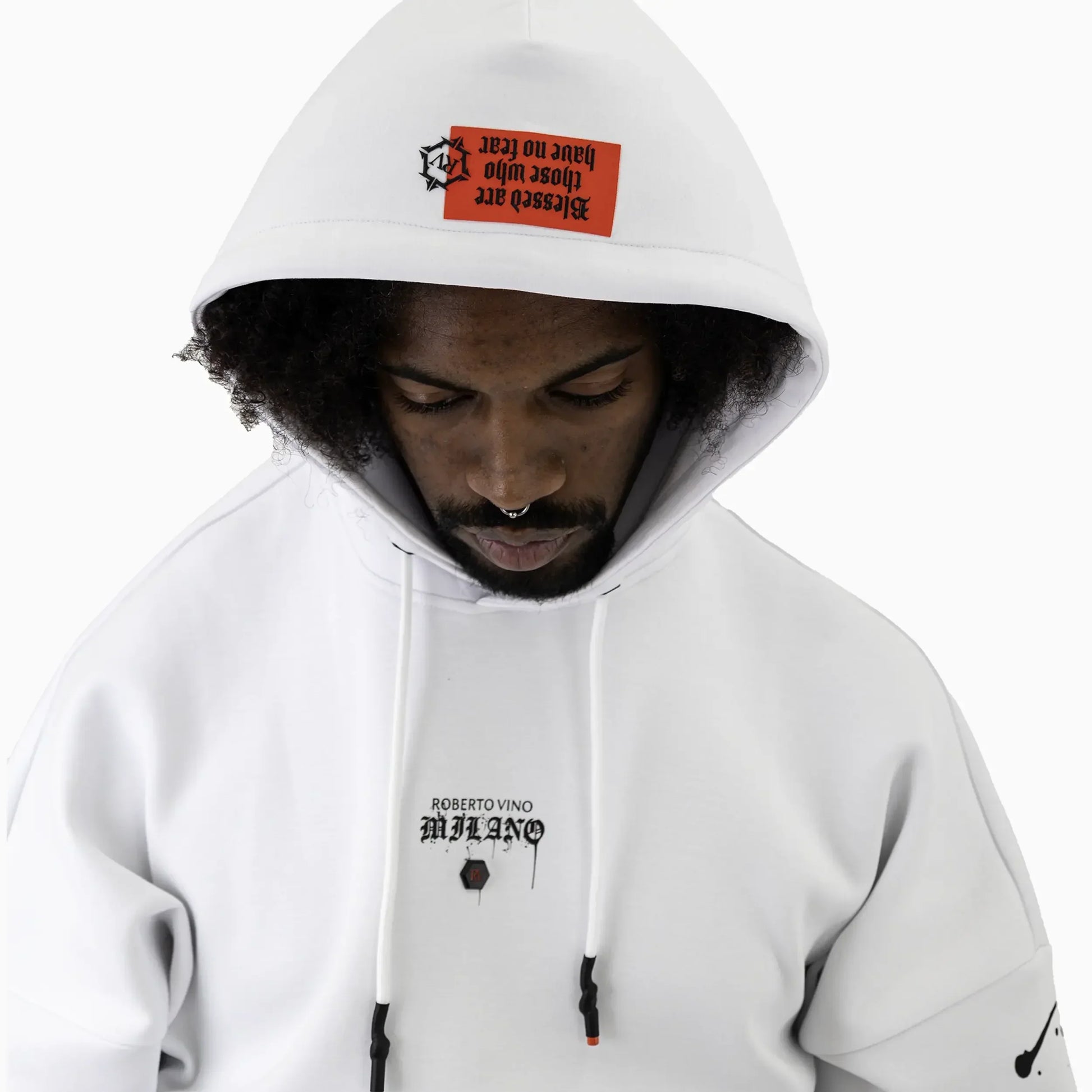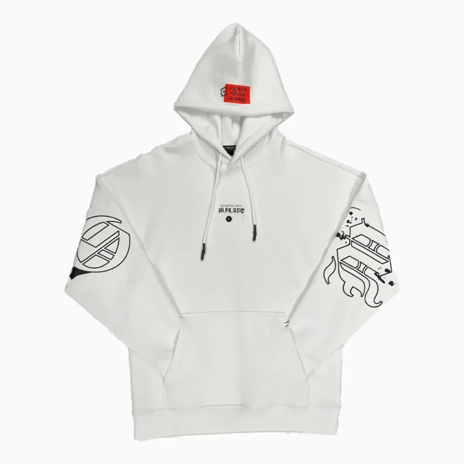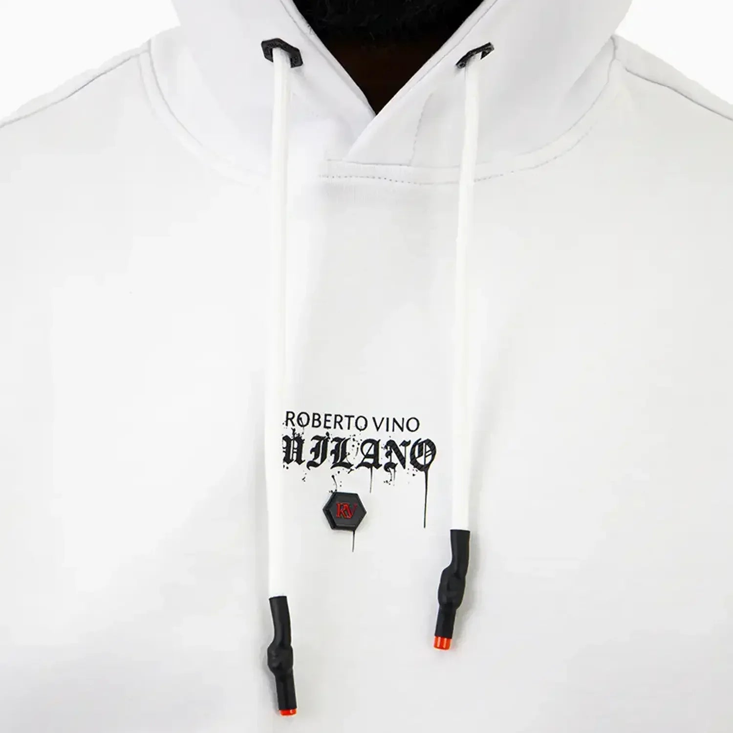 he Milano Paint White Hoodie from the Milano collection blends bold, contemporary design with premium craftsmanship. Made from a blend of 78% cotton, 15% lycra, and 7% polyester, this hoodie is designed to provide a comfortable and flexible fit while maintaining durability. The front showcases subtle "Roberto Vino" branding, accompanied by intricate sleeve graphics that add a modern twist to the design. A distinct red patch on the hood adds contrast, giving the hoodie a unique and striking element.