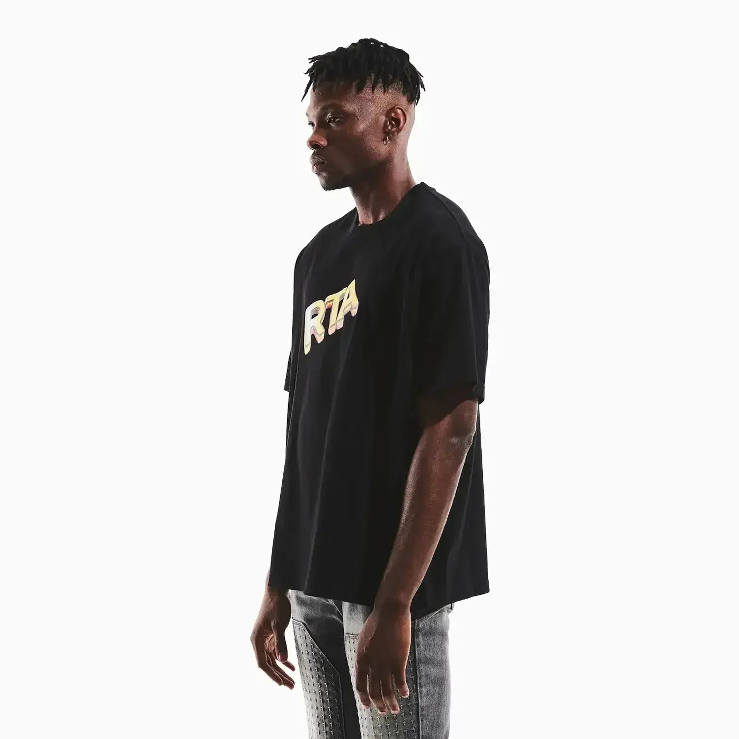 The Colin Oversized Short Sleeve Tee in Black Cash Only is an oversized, crew neck tee made from 100% Cotton. This tee features the RTA logo in a metallic gold gradient and a 3D effect, designed to resemble the look of gold bars.