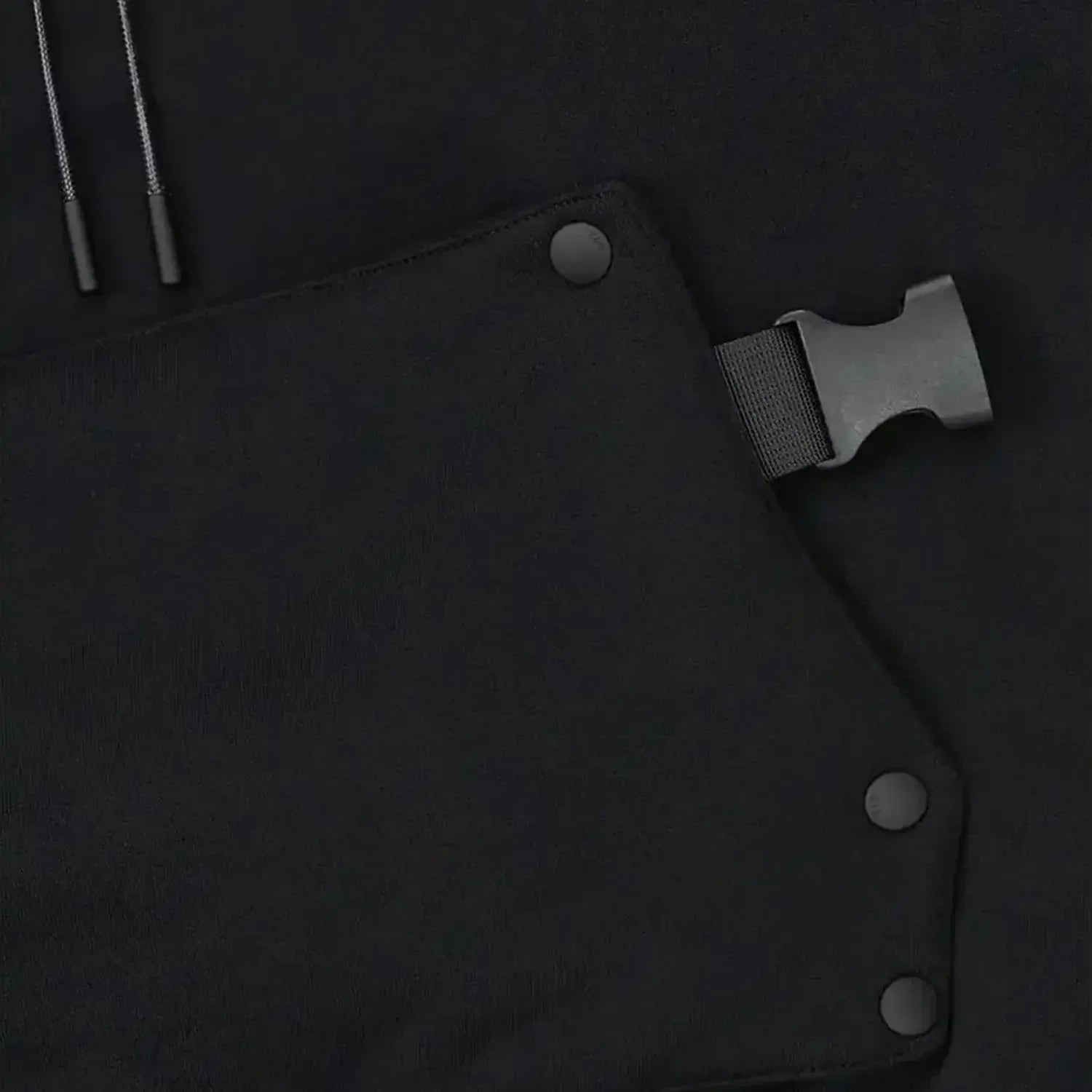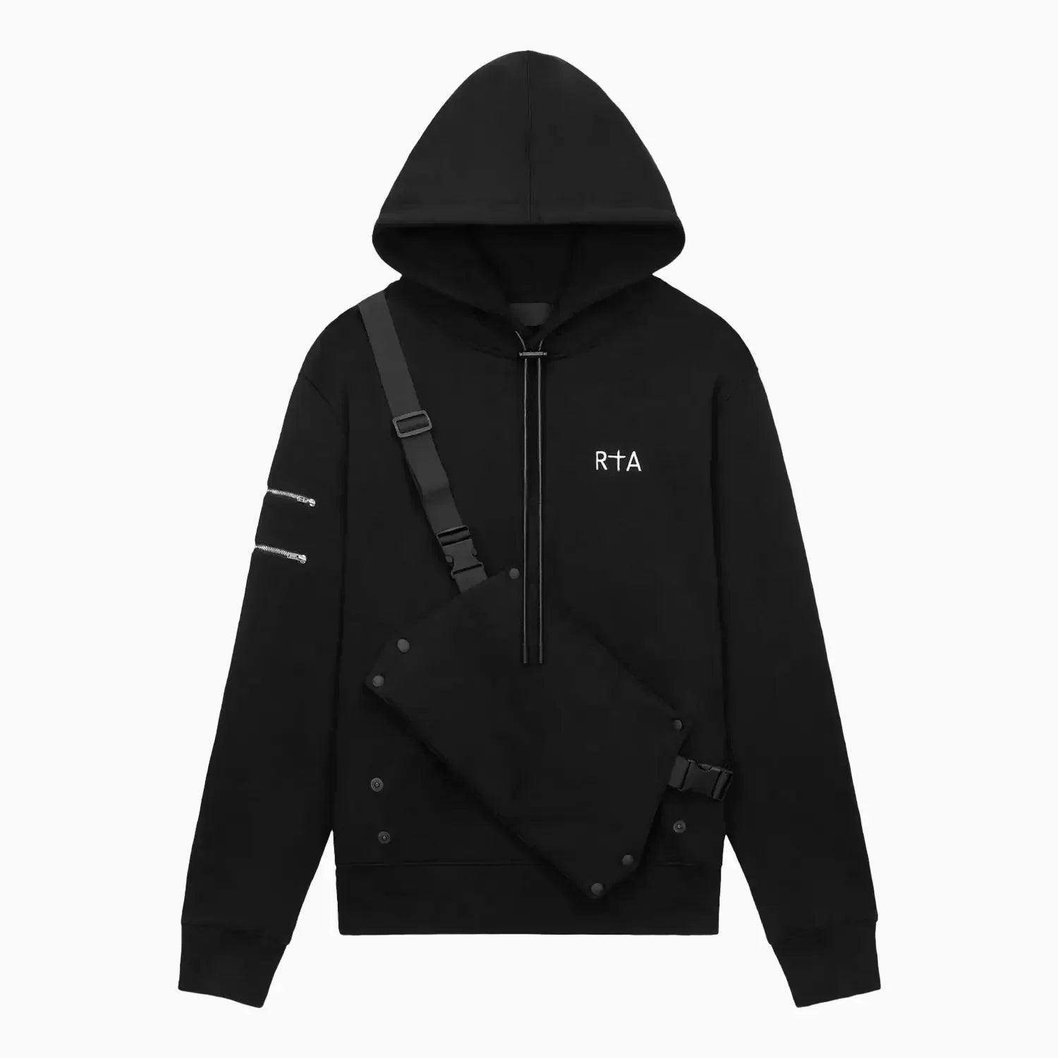 The black Hector Hoodie features a coated toggle drawstring, zippered accents on the arm, and a removable kangaroo pocket that can be turned into a shoulder bag.