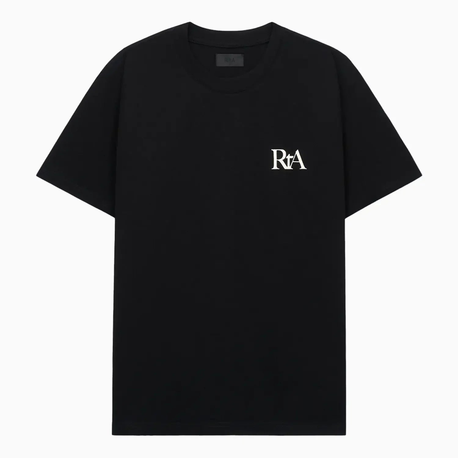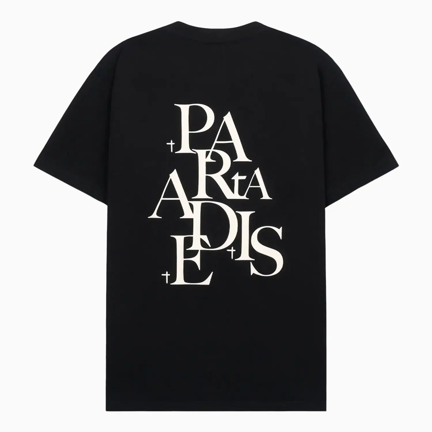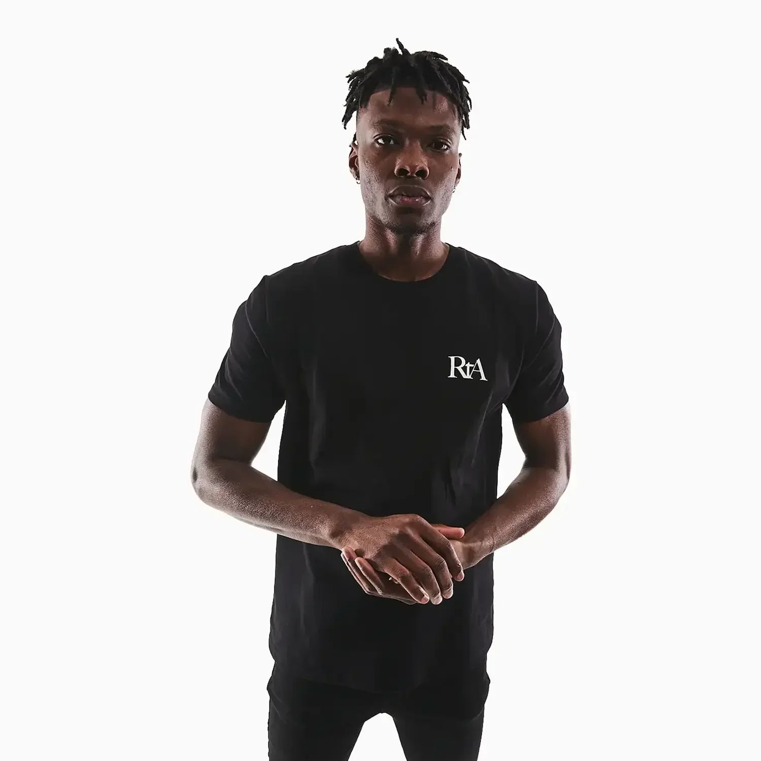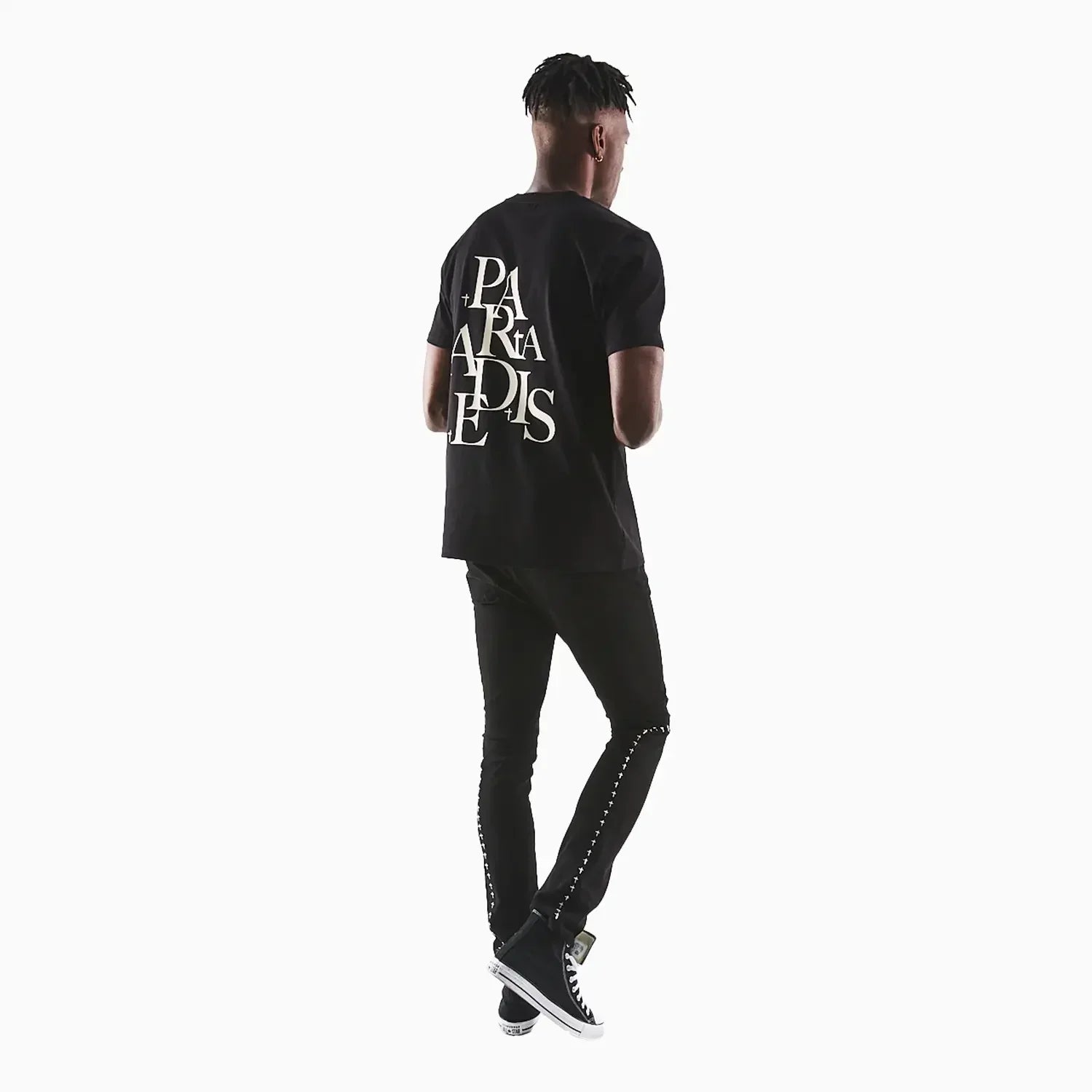 The Liam Short Sleeve Tee in Black Paradise is a regular fit, crew neck tee made from 100% cotton featuring a small RTA logo on the chest and a deconstructed PARADISE graphic, stacked and staggered in an abstract layout with the signature RTA crosses.