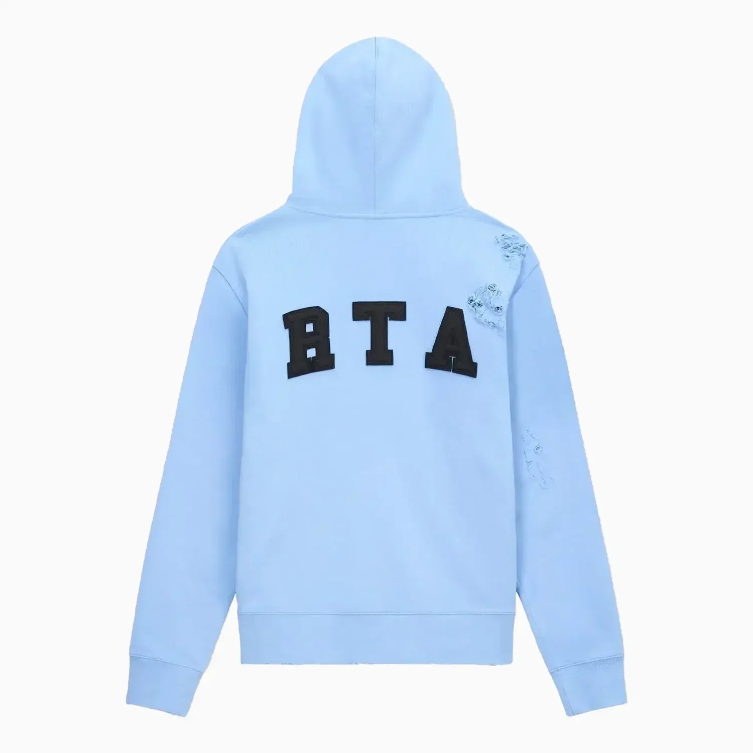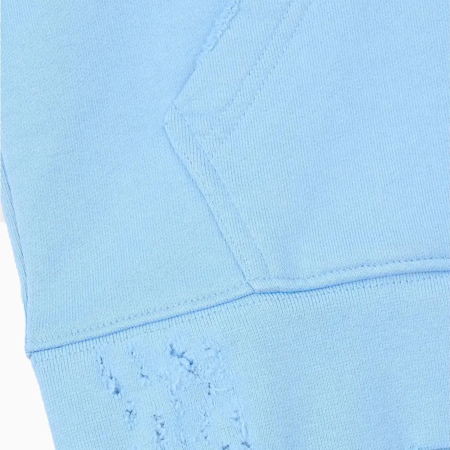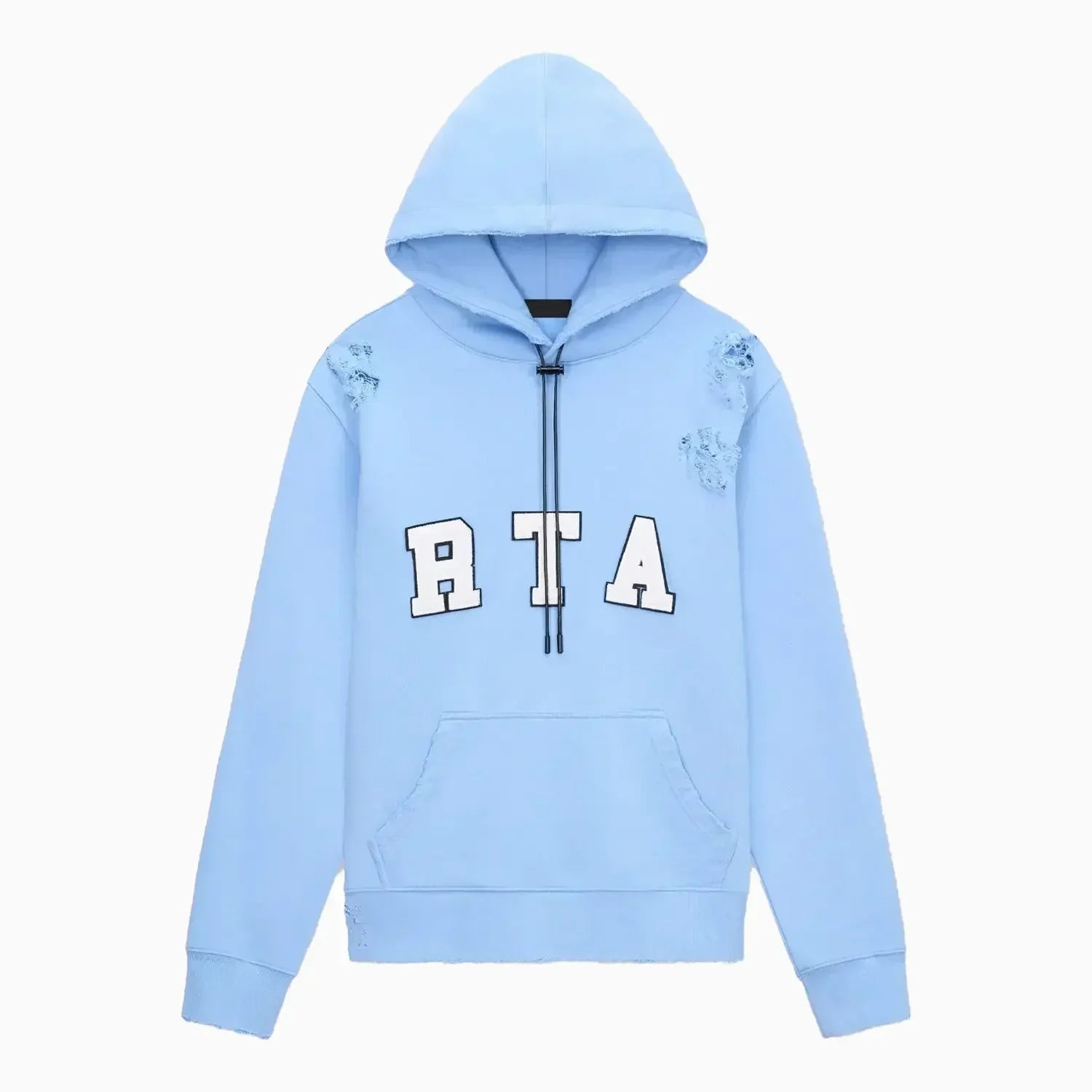 The Markus Hoodie in Sky Blue Collegiate is a classic hoodie featuring distressed details and collegiate-inspired RTA logo patch detail at front with long sleeves and a front kangaroo pocket.