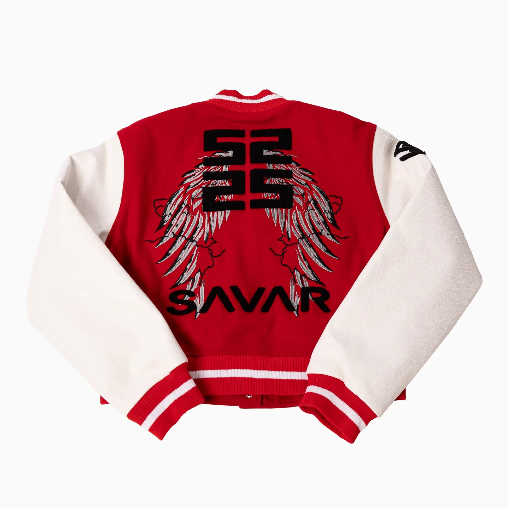 Elevate your style with Savar's Women's Wings Wool Varsity Jacket. Made from high-quality wool, this jacket features a unique wing design that adds a touch of creativity to any outfit. Perfect for chilly days, stay warm and fashionable with this must-have addition to your wardrobe.