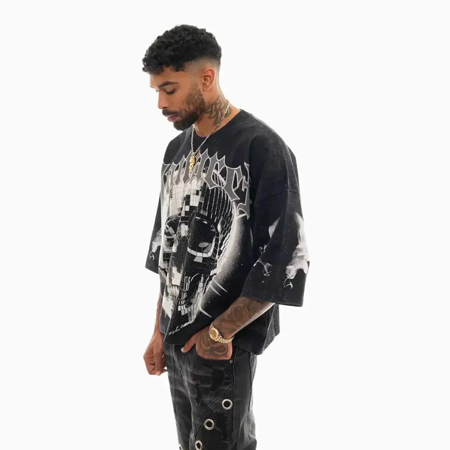 The Men's Monarch Digital Skull Oversized Graphic T-Shirt combines bold design with comfortable fit. Featuring a striking digital skull graphic, this oversized tee offers a modern, edgy look while ensuring ease of movement and all-day wearability. Crafted for those who appreciate distinctive style and relaxed comfort, it’s an ideal choice for casual outings or making a statement.