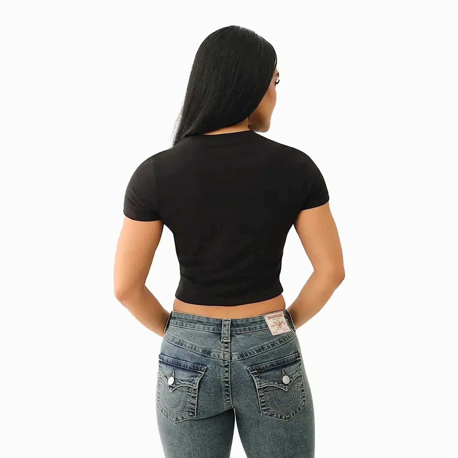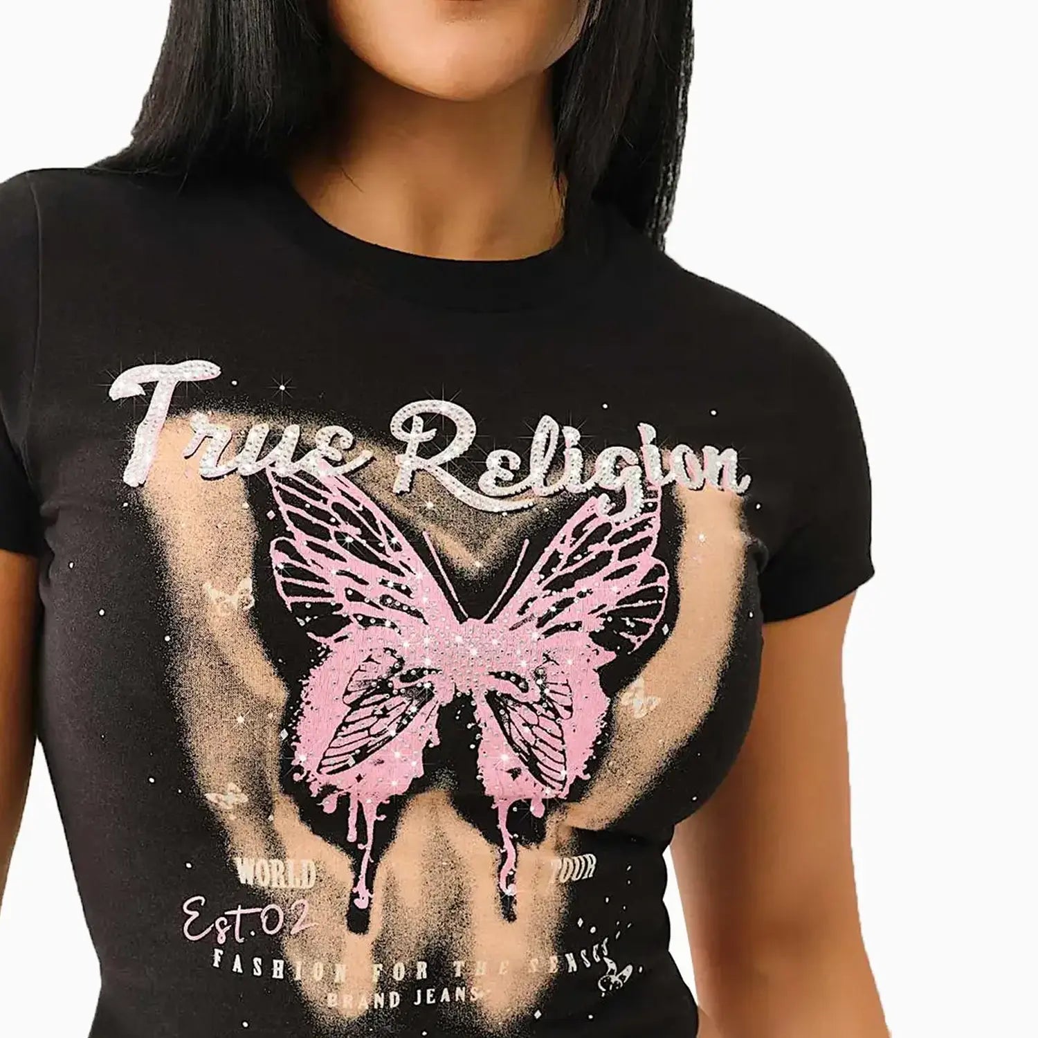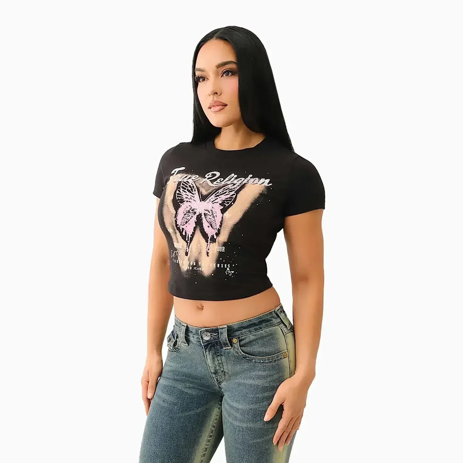 Make your fit an art piece with the Crystal Butterfly Baby Tee. Crafted from a soft cotton blend, this tee features a crew neck, short sleeves, and cropped fit. Complete with a crystal True Religion logo and graffiti-effect butterfly graphic.